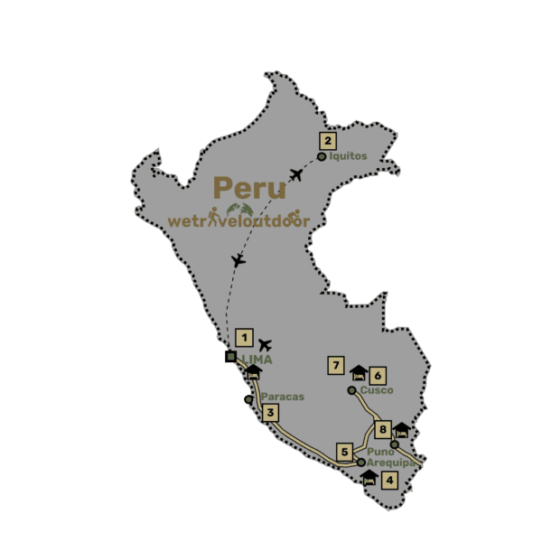 Heb je ongeveer 4-5 weken de tijd voor Peru? Wij stippelden onderstaande reisroute voor je uit om vrijwel alle mooie plekken van het land op je gemak te kunnen bezoeken. Tijdens deze complete reisroute maak je enkele meerdaagse hikes, zoals de Salkantay Trek. Bekijk hier alle stops en informatie voor een reisroute door Peru van 4-5 weken.